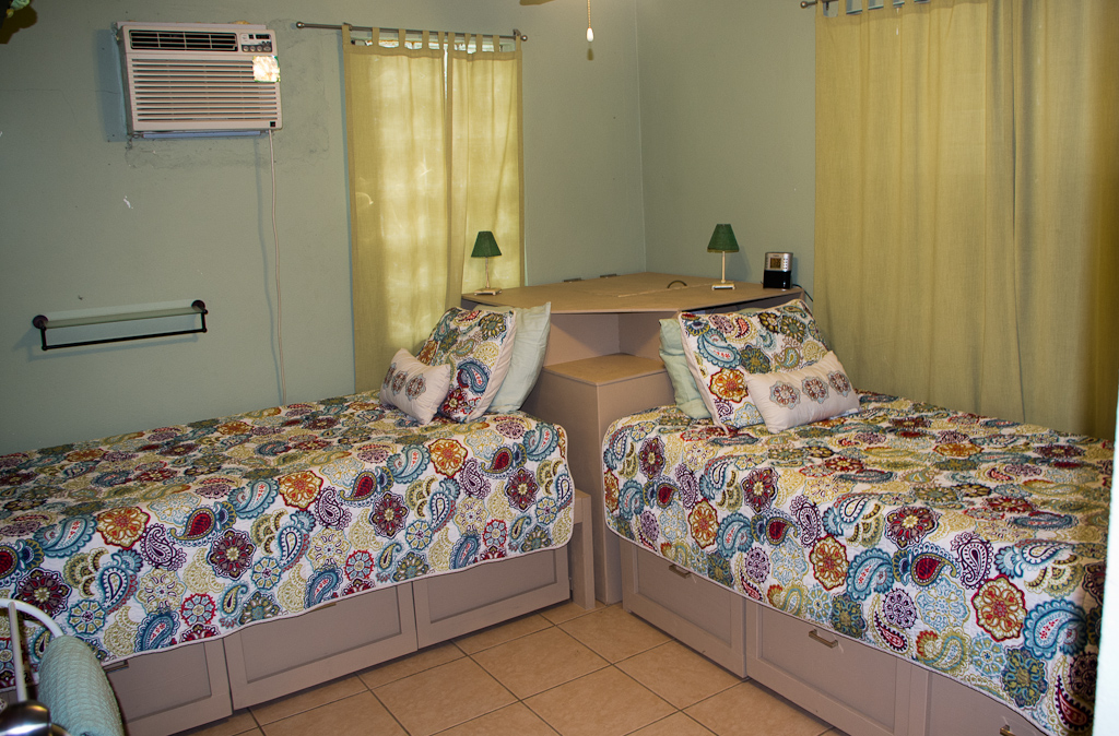 The 3rd bedroom has two Twin beds which sleep one person each. Air conditioning and a ceiling fan are installed. Each bed has 3 large rollout drawers underneath for plenty of storage. A corner headboard cube has cubby holes for charging electronics. This room is perfect for those single dudes on the trip and kids.