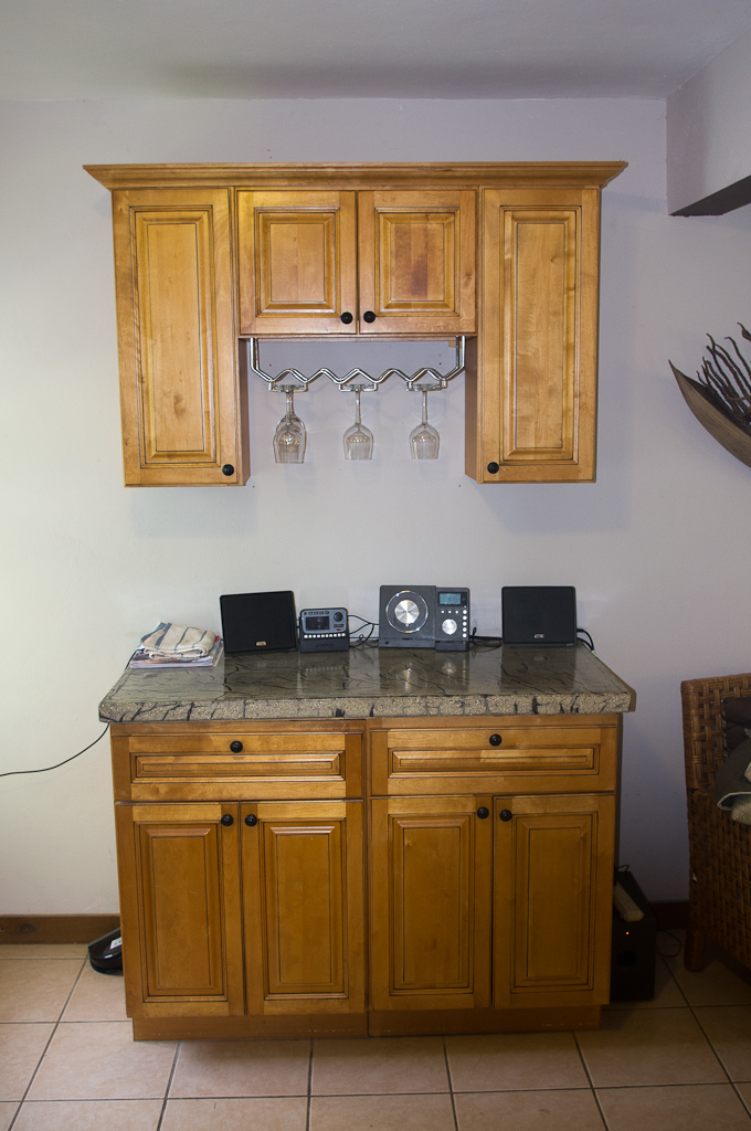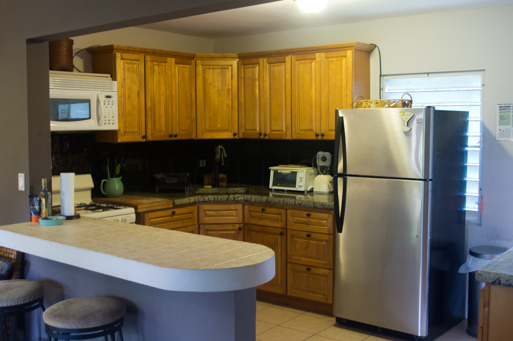 The fully stocked kitchen area contains all the necessities: Blender for Pina Coladas...oh and the usual stuff including pots and pans, silverware, plates, bowls, cooking utensils, coffee pot, microwave, stove, refrigerator (with ice maker). The countertop is a custom designed and built concrete countertop crafted by Jeff, the owner.